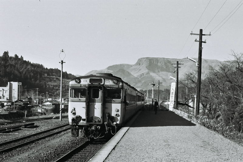 | 1975年の冬休み。別府の叔父叔母が上京するのと入れ替わりに一人で九州旅行をさせてもらった。 東京駅から銀河号に乗り、関西へ。 梅小路蒸気機関車館、大阪駅ホームので列車撮影、九州に入ってからは、各地で列車撮影。 最後は、西鹿児島から特急富士に乗って帰京したが、九州各地を回っている途中の光景がこの写真である。 久大本線の急行に乗って、理由は分からないが、山間の駅でこの写真を撮った。 列車は、撮影時刻からして、急行「由布号」「日田号」だ。 後ろの九重の山の姿が印象的だったのだろうか。 12月の九州でもやはり寒かった記憶がある。 1975年12月31日 10:28 久大本線豊後中村駅 |